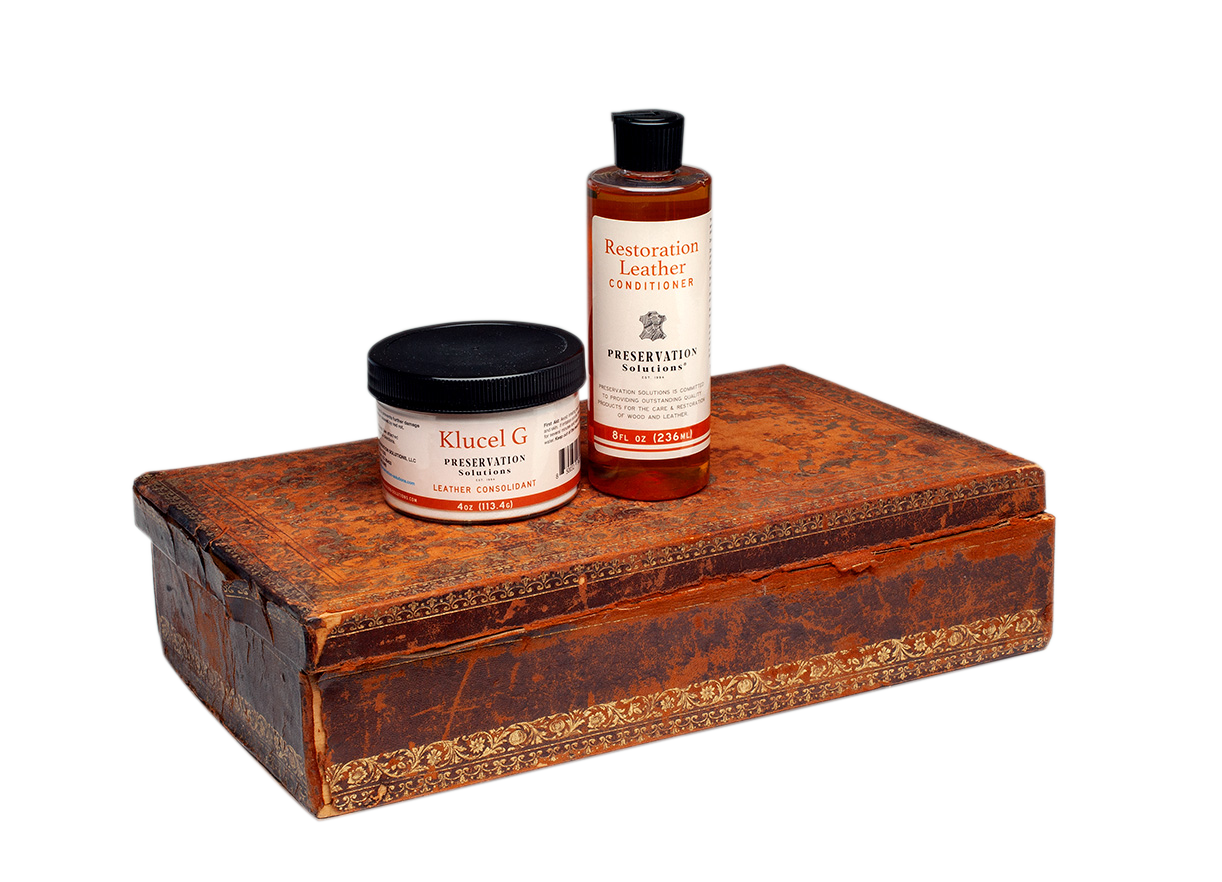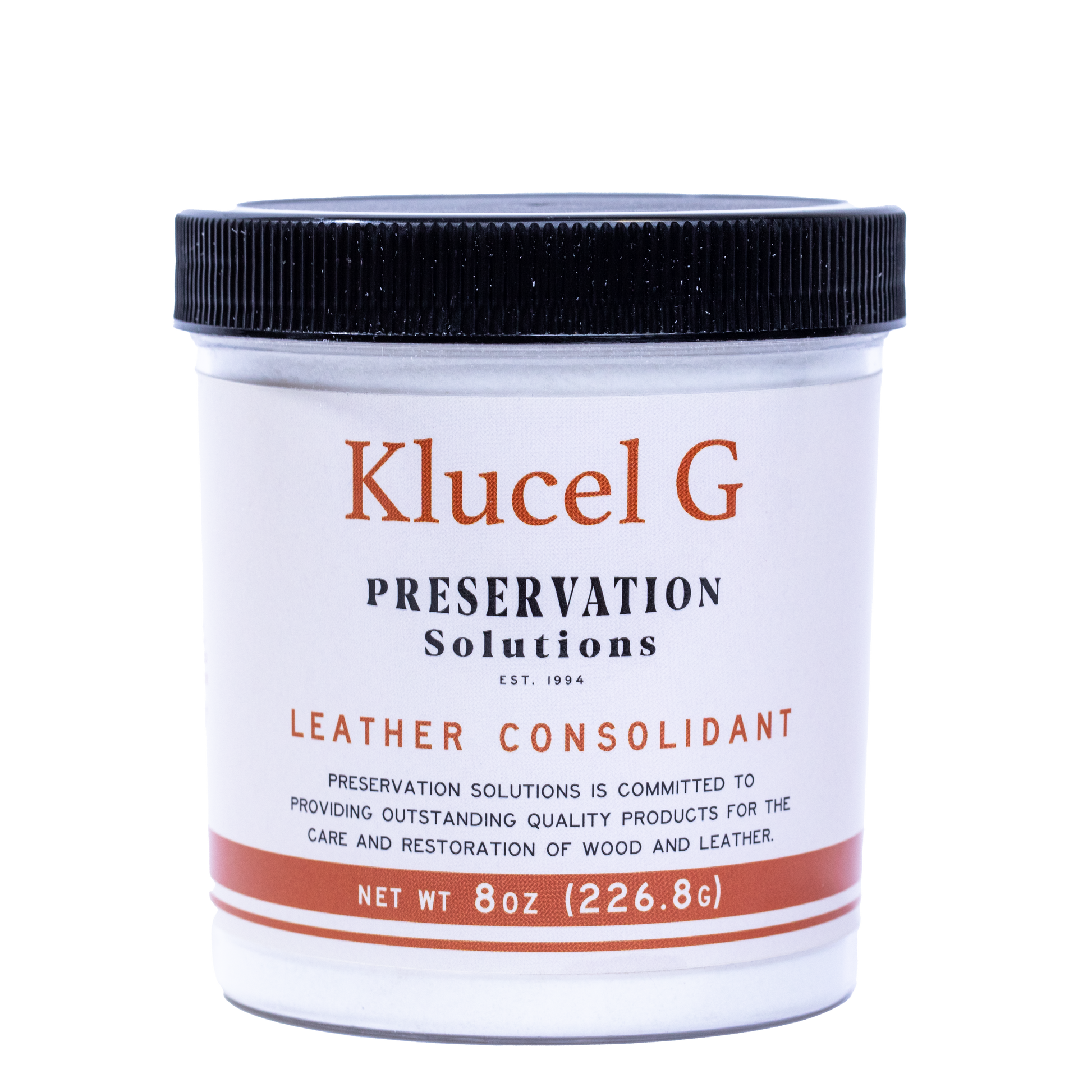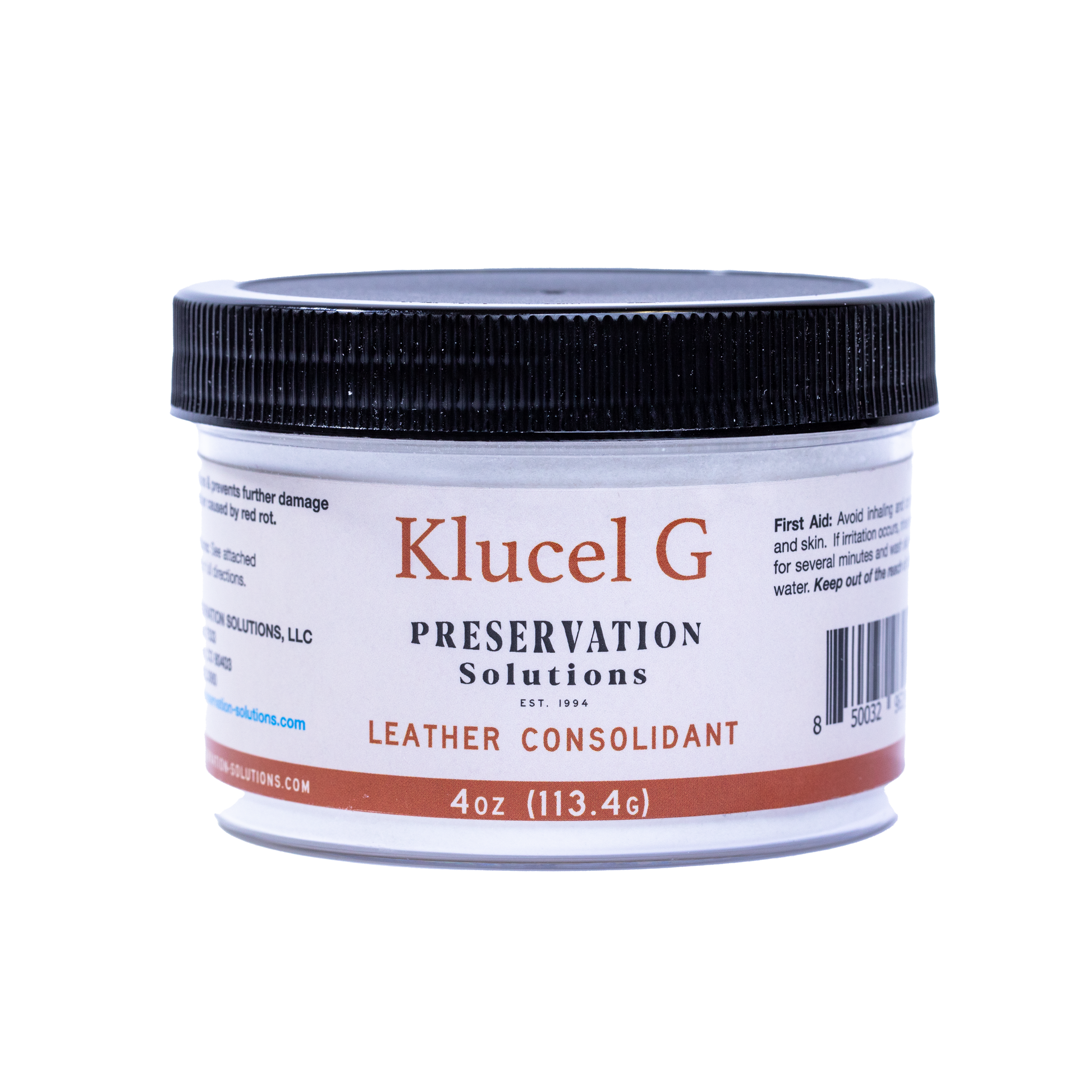 Preservation Solutions’ Klucel G is a leather consolidant used to treat leather that is starting to deteriorate or become powdery from a condition called “Red Rot”. It creates a permanent flexible webbing which strengthens the leather and prevents the spread of “Red Rot”. It is excellent for treating and repairing deteriorating leather books/bindings and other fragile antique leather articles.