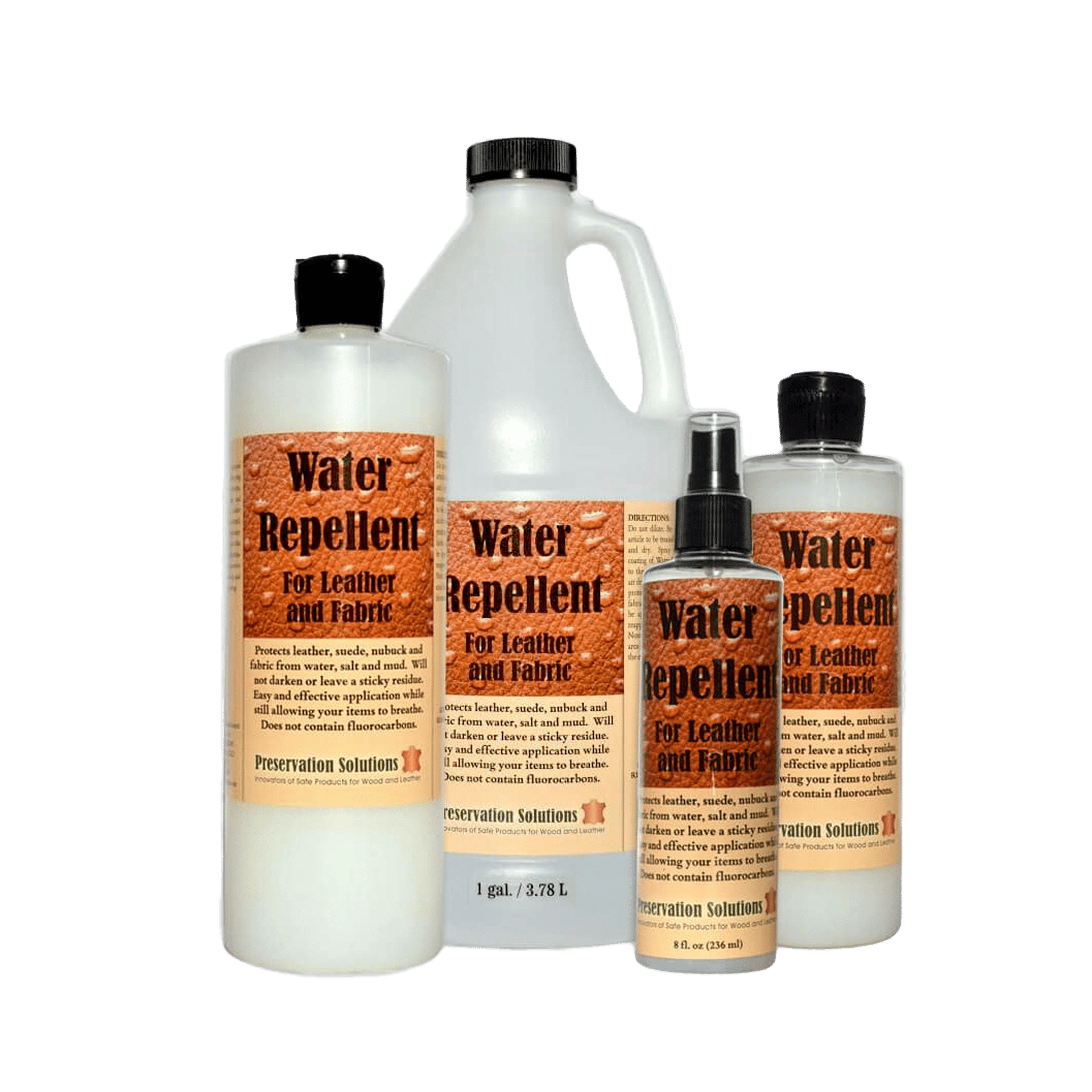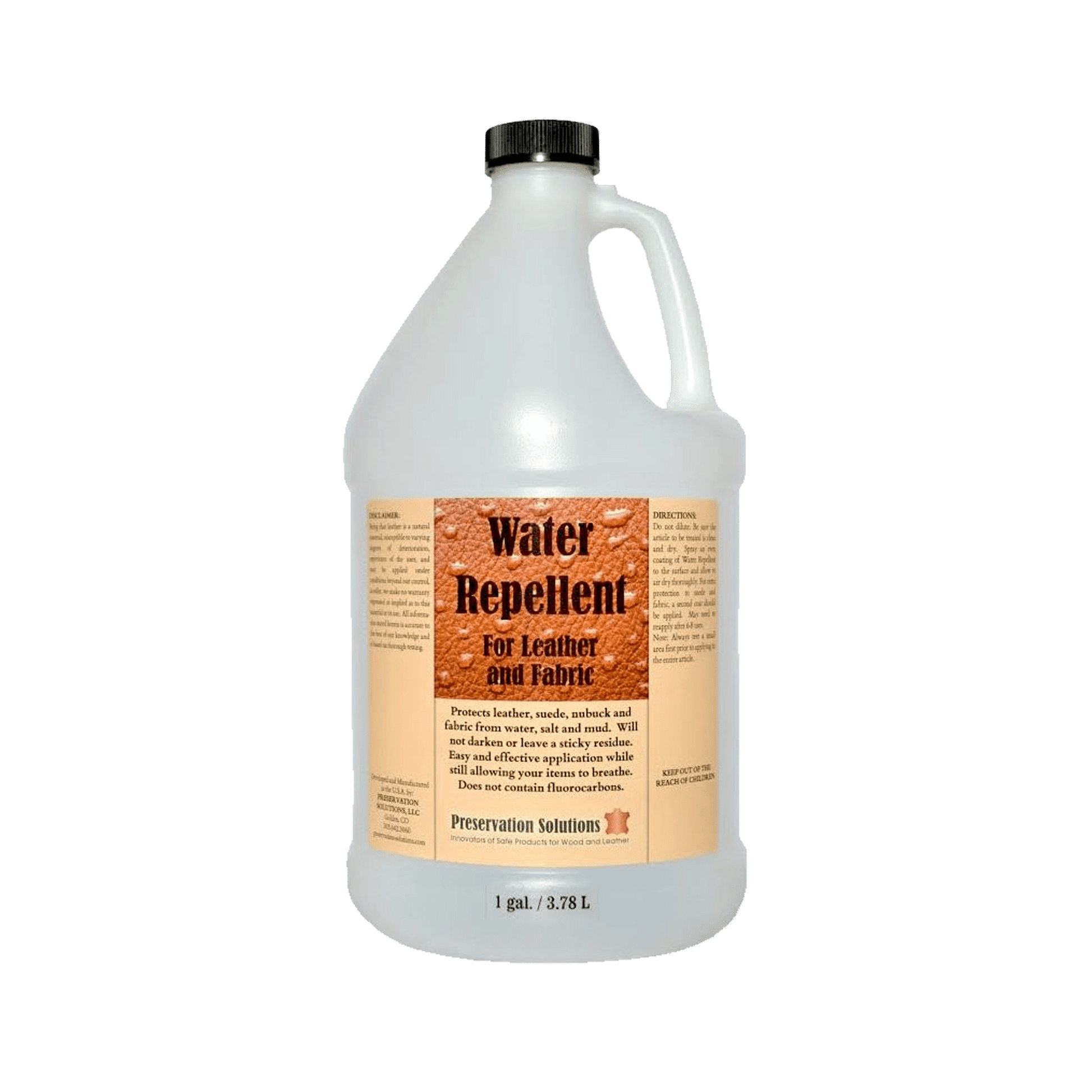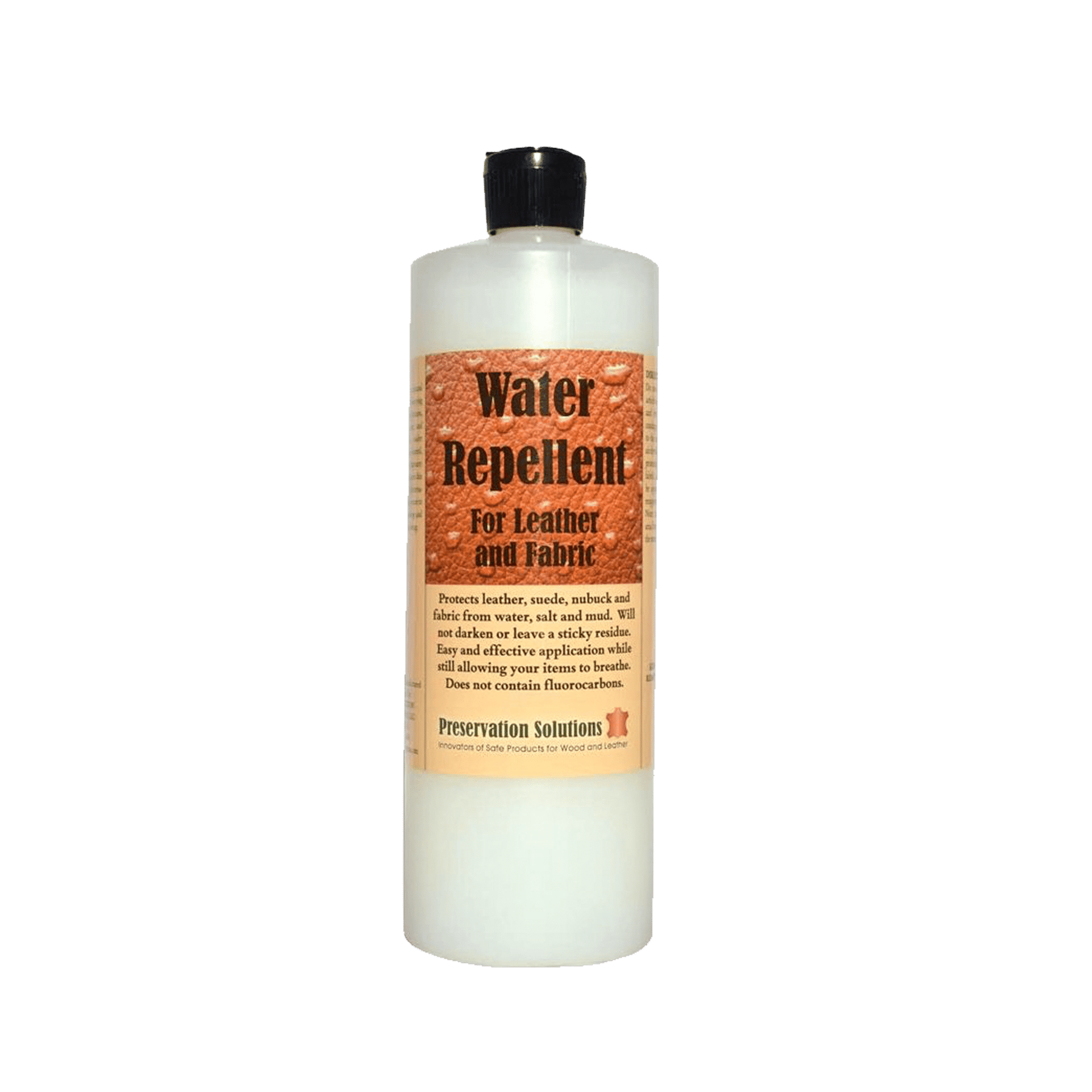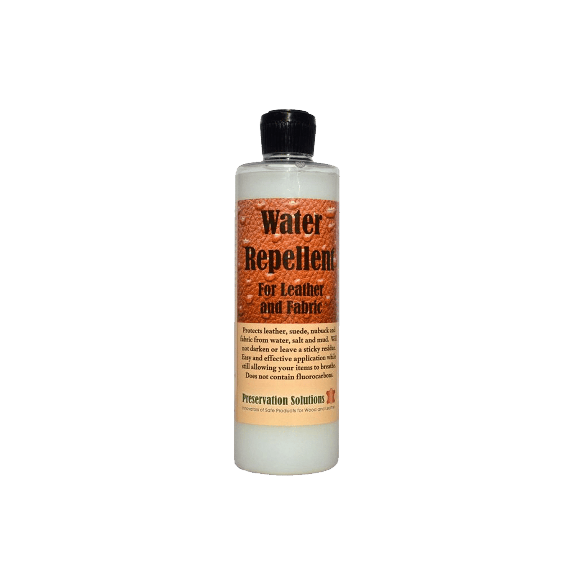 Designed to repel water (moisture) and mud on leather, nubuck and fabric items while still allowing the items to breathe. The easy to use Water Repellent will dry quickly while not darkening the leather or fabric and will not leave it oily or sticky. It does not contain waxes, silicones or petroleum products.
